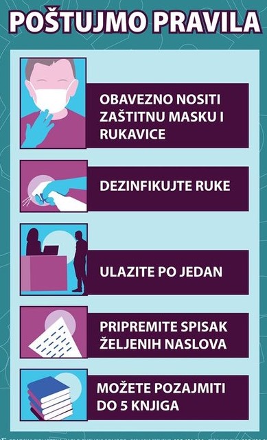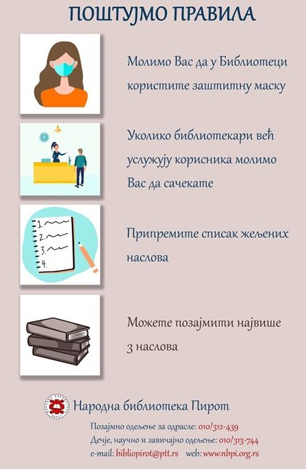 БИБЛИОТЕКЕ предузимају све неопходне мере ради превенције ширења вируса ЦОВИД-19, а подсећамо вас да, у складу с актуелном епидемиолошком ситуацијом, носите заштитне маске приликом доласка убиблиотеку, као и да се придржавате свих осталих превентивних мера заштите како бисте сачували своје здравље и здравље наших библиотекара.